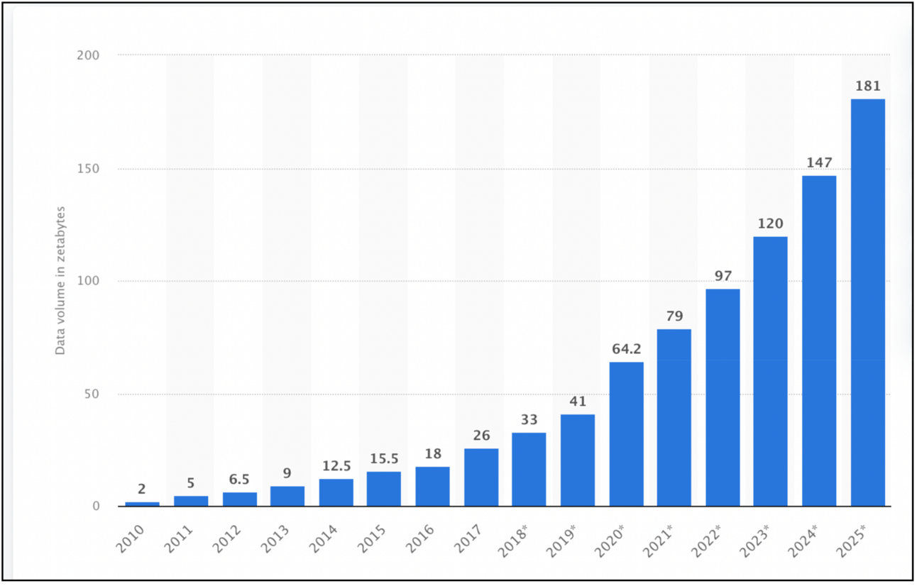 By 2025, the total volume of existing data is projected to be 181 zettabytes.