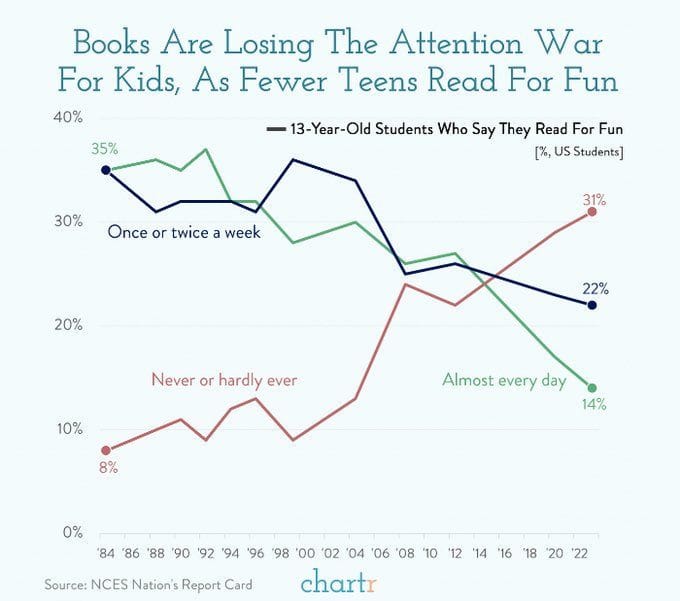 K-12 data backs this up. Nearly 1 in 3 13-year-olds “nearly or hardly ever” read for fun. Only 14% read every day, down from 35% in 1984.